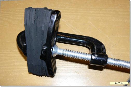 Потом надо нагреть пластик, на который приварена резина и слегка изогнуть. Я пользовался двумя струбцинами, подкладушкой и строительным феном. Кстати, дырки и саморезы подходят родные, не надо ничего лишнего сверлить.