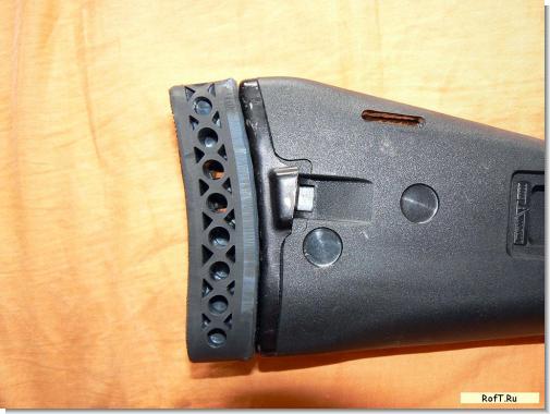 Только я дырку для кнопки не делал. Выбрал под кнопку круглой самодельной коронкой канал в резине почти до самого конца и вставил пластмассовый цилиндрик 1 см длиной в качестве толкателя. Теперь для раскладывания приклада надо слегка нажать в определенном месте затыльника и все. Кто не знает фокуса - приклад не откроет, соответственно стрелять не сможет, т.к. предохранитель заблокирован при сложеном прикладе. Вот результат.