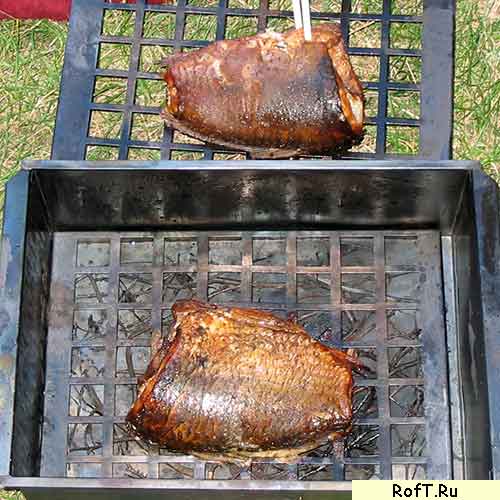 Рыба жареная в углях углях завернута в фольгу. С лимоном и