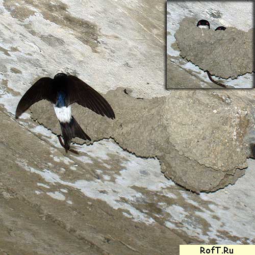 На большой фотографии видно как ласточка подлетела и пытается залезть домой, а на маленьком фрагменте видны два голодных любопытных птенца, торчащие из гнезда.