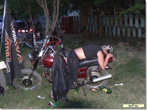 А потом началось не менее интересное выступление самопальных групп и авторских коллективов. И хотя развлекательное фаер-шоу и стриптиз на сцене продолжалось до двух ночи, шоу в палаточном городке продолжалось до самого утра. Ведь пьяным байкерам всегда есть чем занятся. Вот компания ребят пытается прикурить из выхлопа байка. Который делает дррряннь и из выхлопной трубы летит поток огня. Очевидно что прикурить ребятам удалось только минут через 20-40 беспрерывного рева.