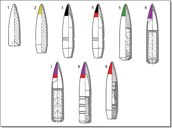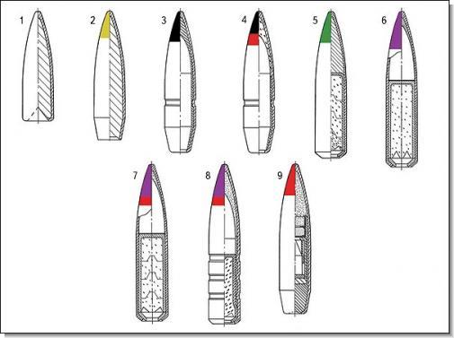 1 - Л, лёгкая; 2 - Д, тяжёлая дальнобойная; 3 - Б-30, бронебойная; 4 - Б-32, бронебойно-зажигательная; 5 -Т-30 (Т-46), трассирующая; 6 - БТ, бронебойно-трассирующая, 7 - БЗТ, бронебойно-зажигательно-трассирующая; 8 - БЗТ модернизированная (ЗБ-46); 9 - ЗП (ПЗ), пристрелочно-зажигательная