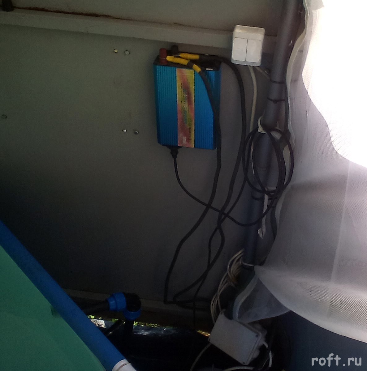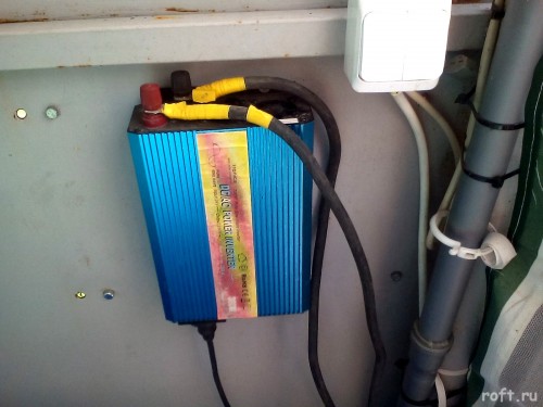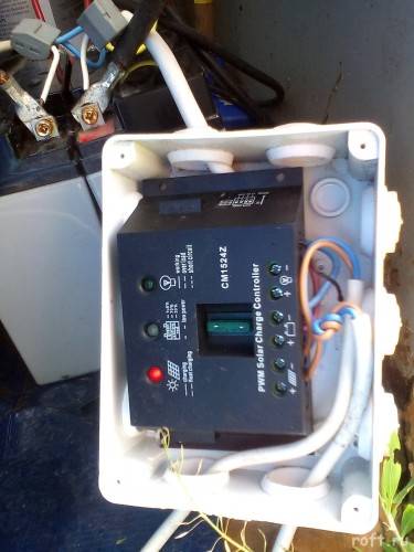 Крепление солнечных батарей, расположение оборудования, установка контроллера заряда в герметичную коробку. Инвертор на стене.