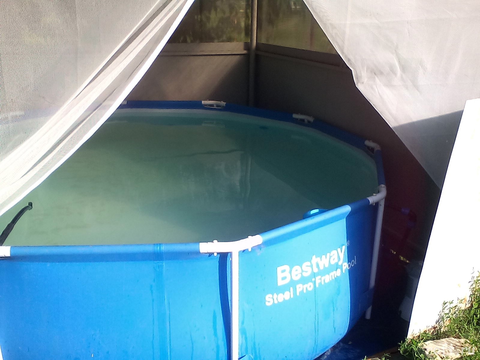 Самое сложное было - это избавиться от родных полупрозрачных гофрированных шлангов к фильтру-насосу от бассейна. Эти шланги в течение сезона превращались в грязесборник, а на свету еще и зазеленели.
