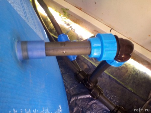 Подключение ПНД трубы в штатные дырки каркасного бассейна. Можно обжать хомутом, но и так держится крепко и не течет.