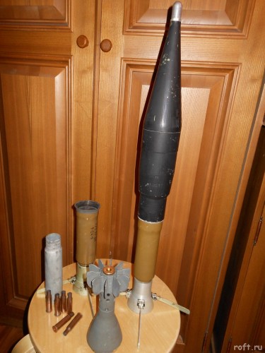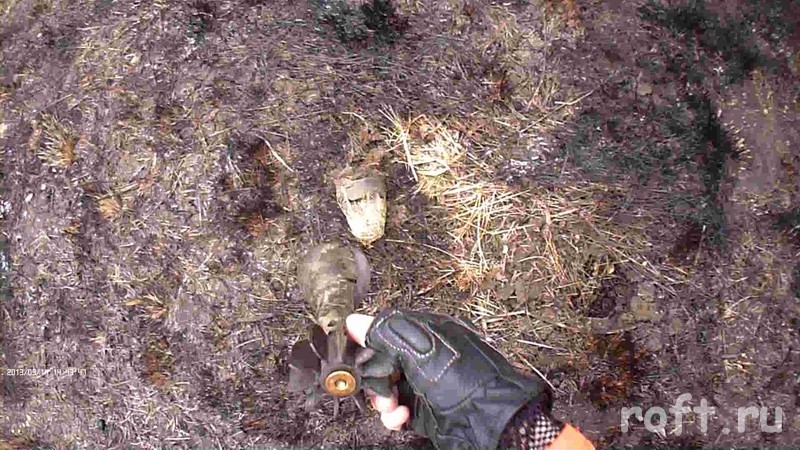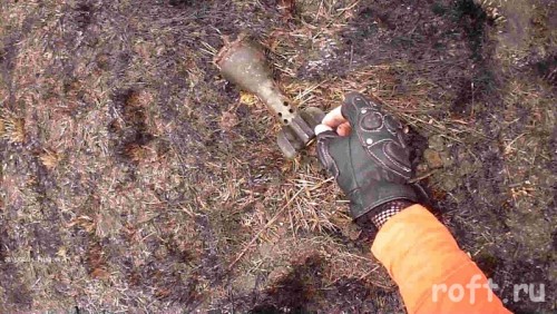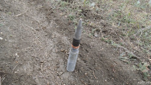 А вот еще один экземпляр кумулятивного выстрела от граника. Голова со взрывателем от удара отвалилась, а сам заряд остался на месте, ждет своего часа. Хорошо заметна воронка, направляющая струю.