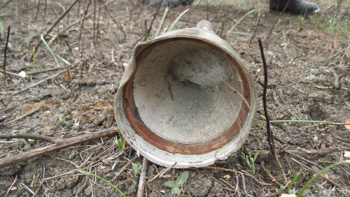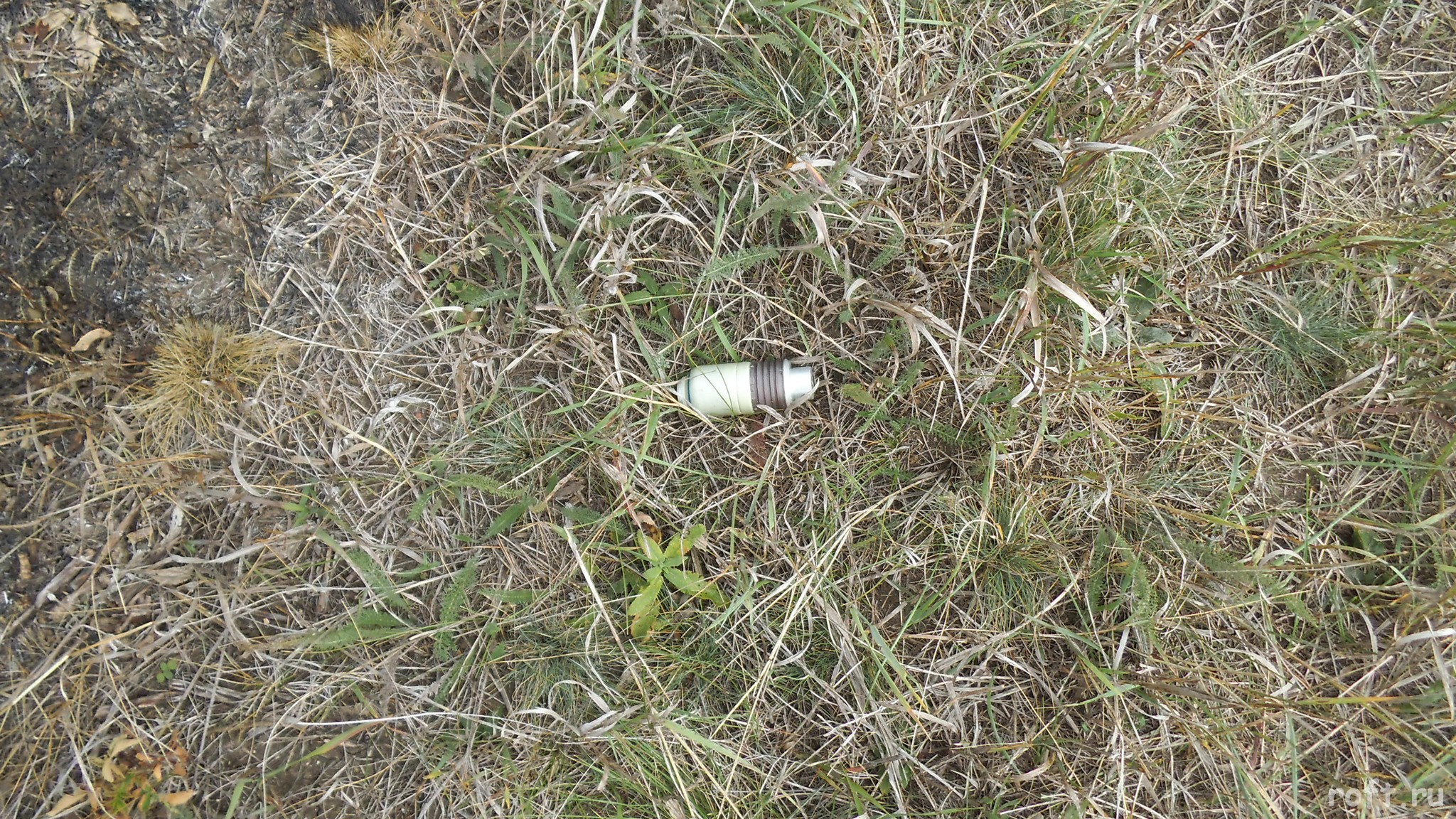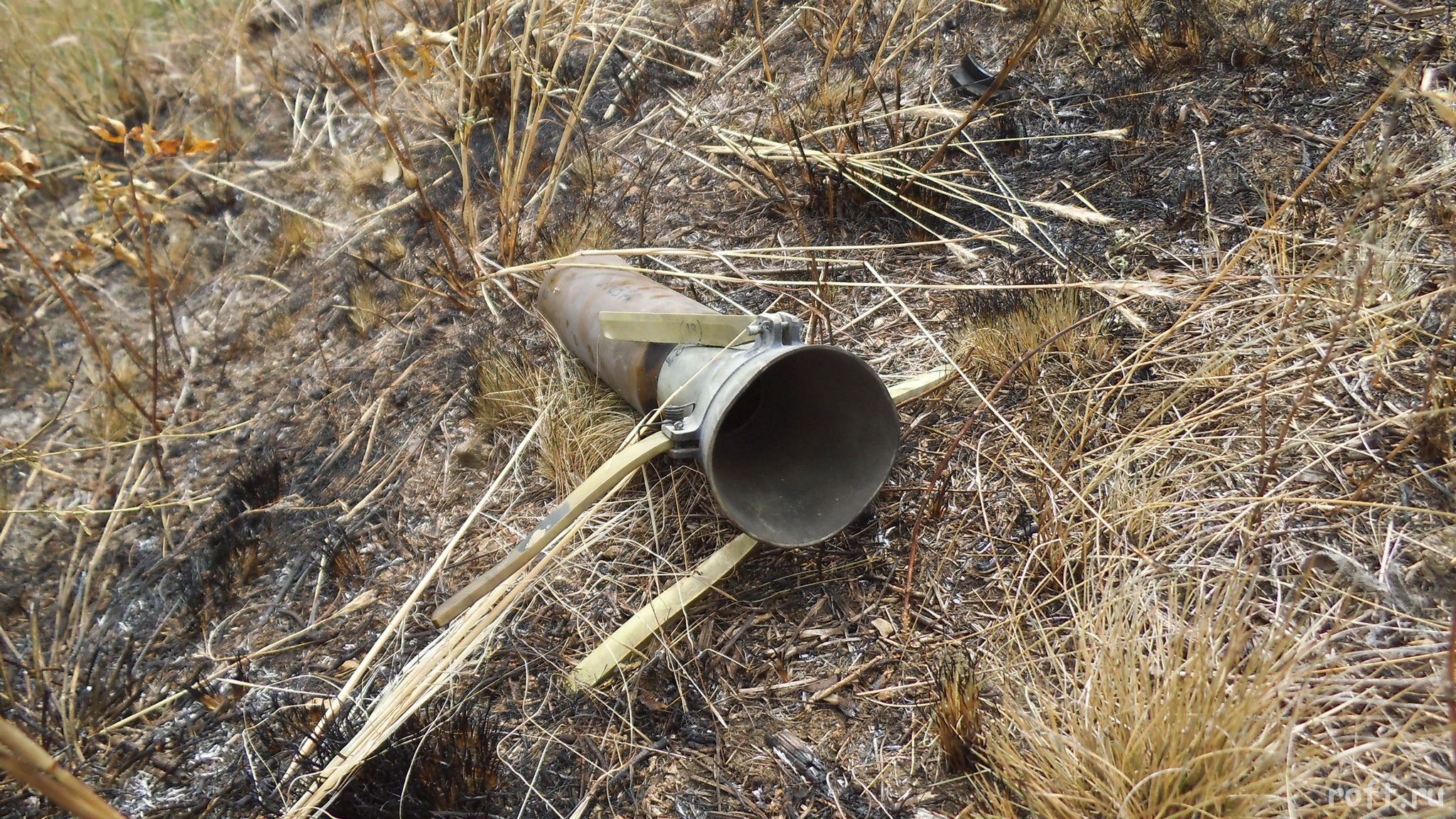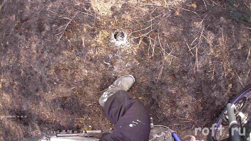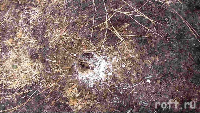 Еще одна часть полигона изрыта воронками от мин. Некоторые мины не взорвались, а выгорели зарывшись в землю. Вот дыра с заметным хвостовиком мины.
