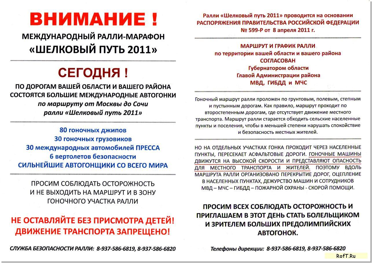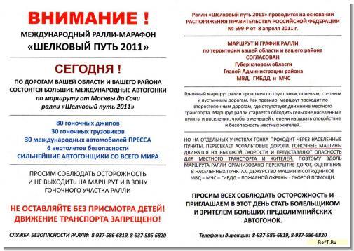 Вот такие листовки разбрасывали с вертолета по всему маршруту, но отдельные безголовые личности выпирались на трассу гонок все равно. Хоть она и проходит по непролазным местам, но русский человек пролезет везде.