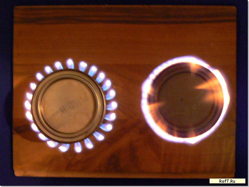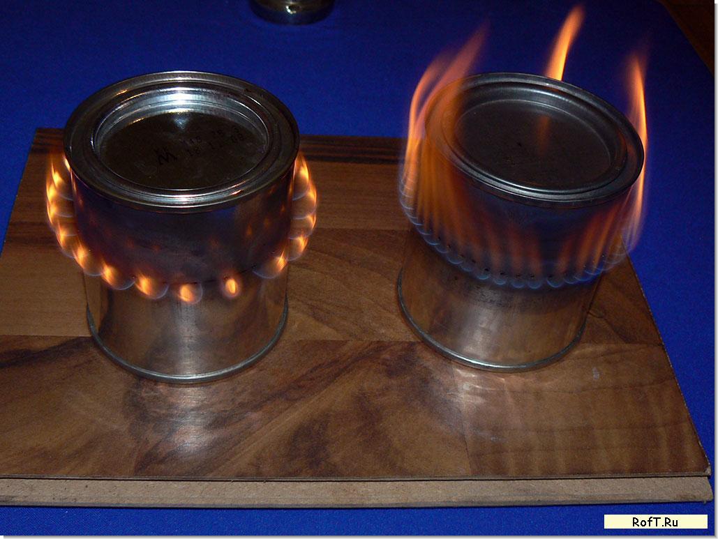 Ну не совсем конечно, теперь учимся ее разжигать. Надо залить спирта и закрыть крышку, 50 мл горит минут 15 и больше. Поставить на негорючую поверхность и слегка встряхнуть так, чтоб спирт через отверстия немного облил банку снаружи. Поджигаем спирт снаружи и ждем пока он выгорит. Повторяем процедуру до тех пор, пока у нас не получится самоподдерживающееся пламя из импровизированных форсунок вокруг банки. Обычно достаточно повторить 2-3 раза и все начинает работать само.