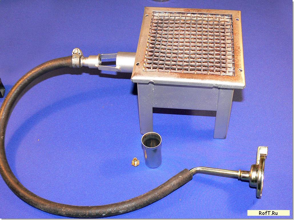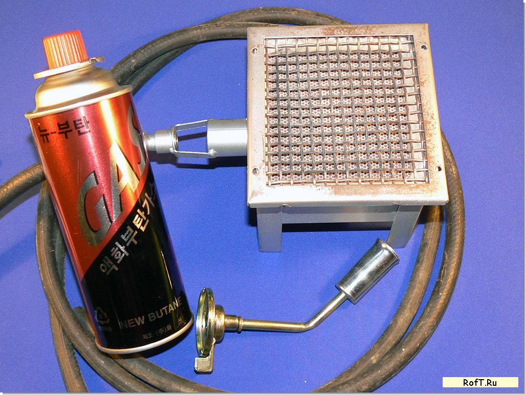 Придется сходить в магазин или на рынок и купить там горелку инфракрасную керамическую, баллончики с газом типа "дихлофосных", горелку-насадку с краном и кусок 5мм кислородного шланга.