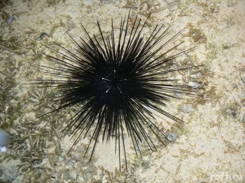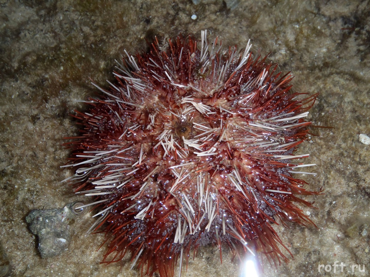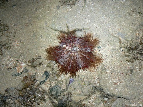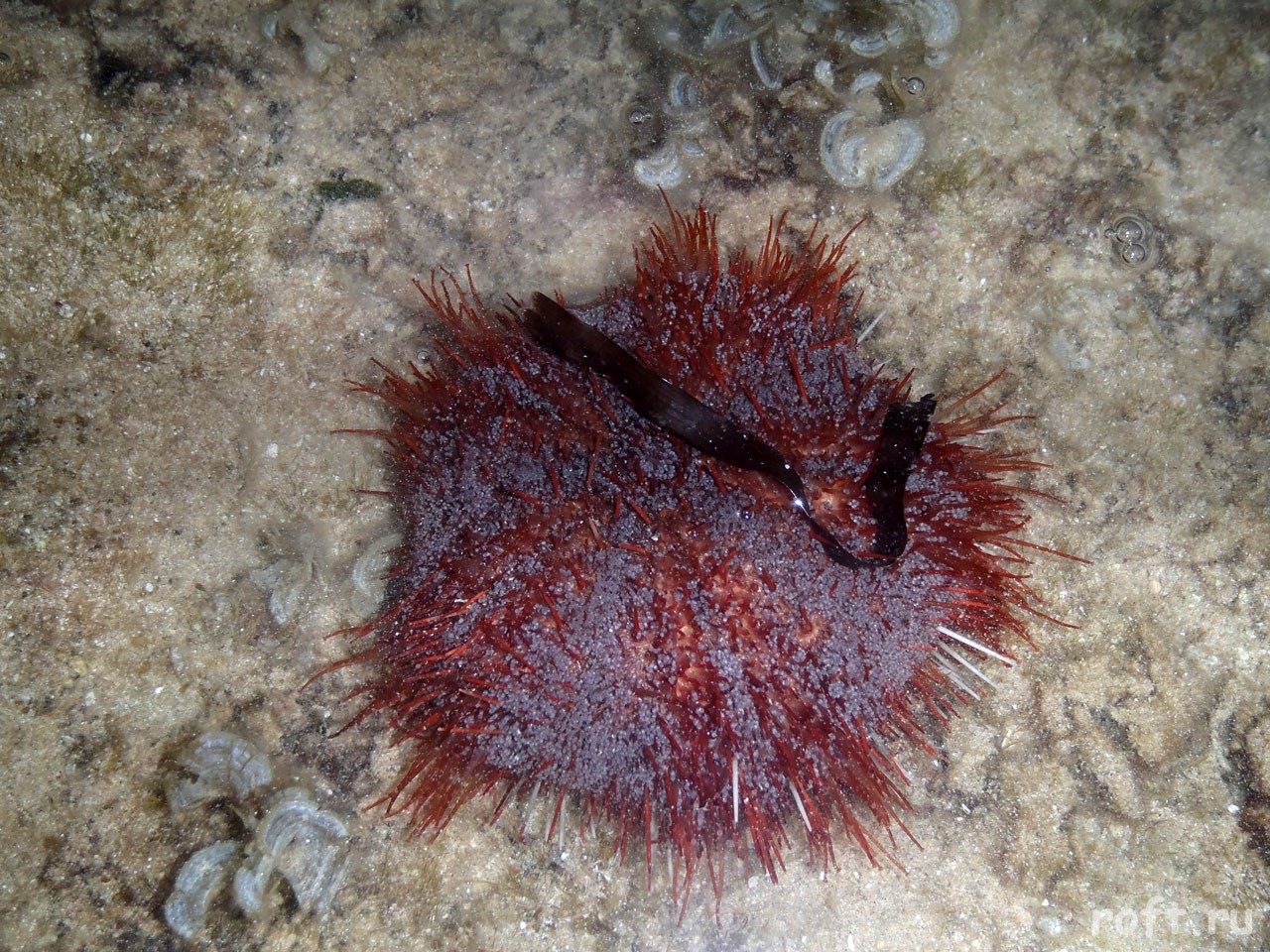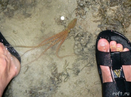 Это чудо зацепилось за ногу, когда бродил по мелководью в отлив ночью. Посветив фонариком я его спугнул и он выпустив рыжее пятно скрылся в водорослях.