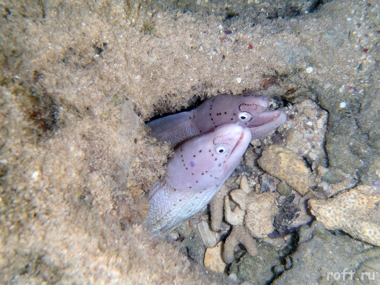 Две сестрички муренки. Длина их около полуметра, на вид ближе к змеям, а не к рыбам.