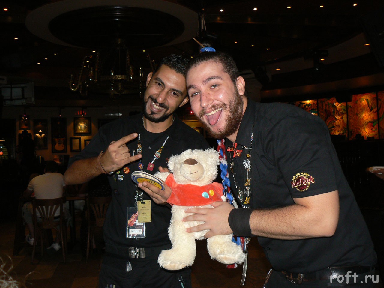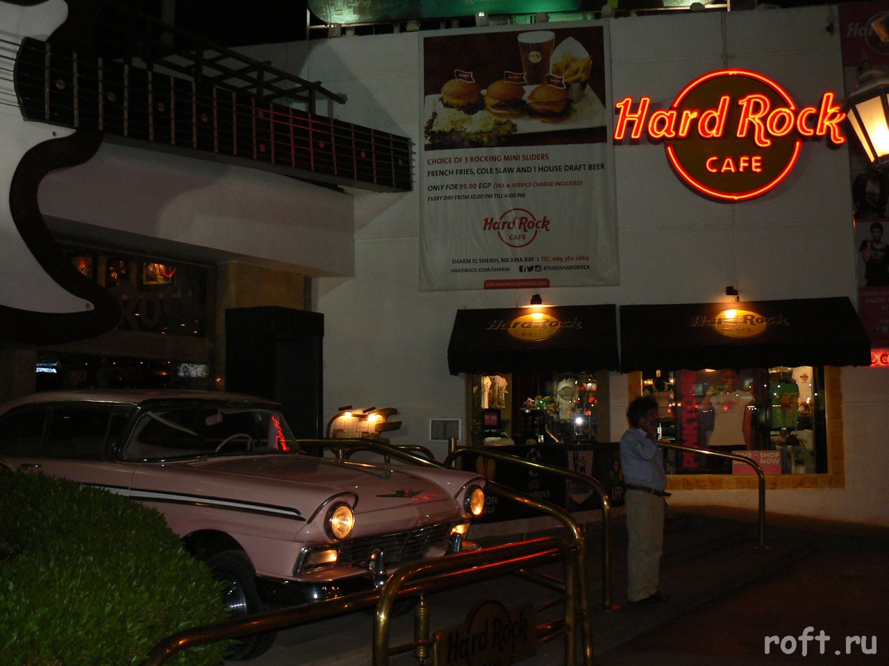 На туристической улице Наама Бей притаилось знаменитое Хард Рок Кафе с розовым Кадиллаком на входе и неповторимой атмосферой внутри. Надо заметить, что весьма дорогой атмосферой, посидеть вдвоем с пивом и мясом получится примерно на 150 баксов.