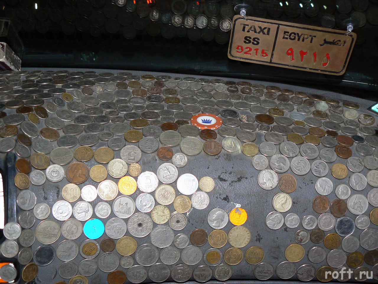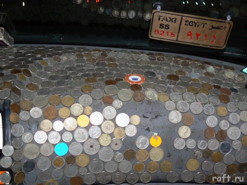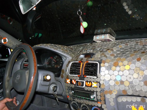А вот этот замечательный таксист взял и обклеил приборную панель машины монетами.