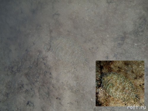 Вот такие "рыбы" ползают на мелководье, размер как раз на сковородку. Заметить очень сложно, я выкрутил на кропе на максимум контраст что бы показать ее подробнее. Рыба не плавает, а ходит по дну как сороконожка на своих видоизмененных плавниках по кругу.