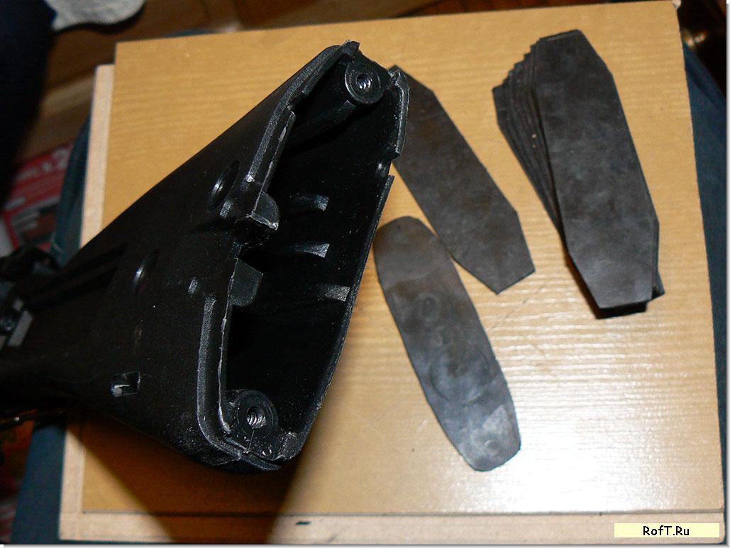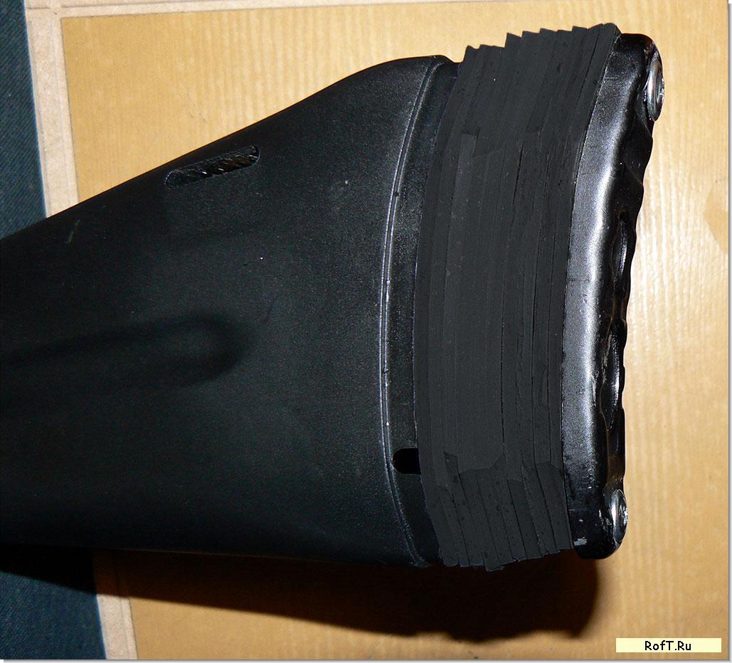 Пришлось покумекать и придумать несколько способов удлинения штатного приклада. Первый способ, который я попробовал - это снять родной металлический затыльник и нарезать из листовой резины прокладку нужной толщины.