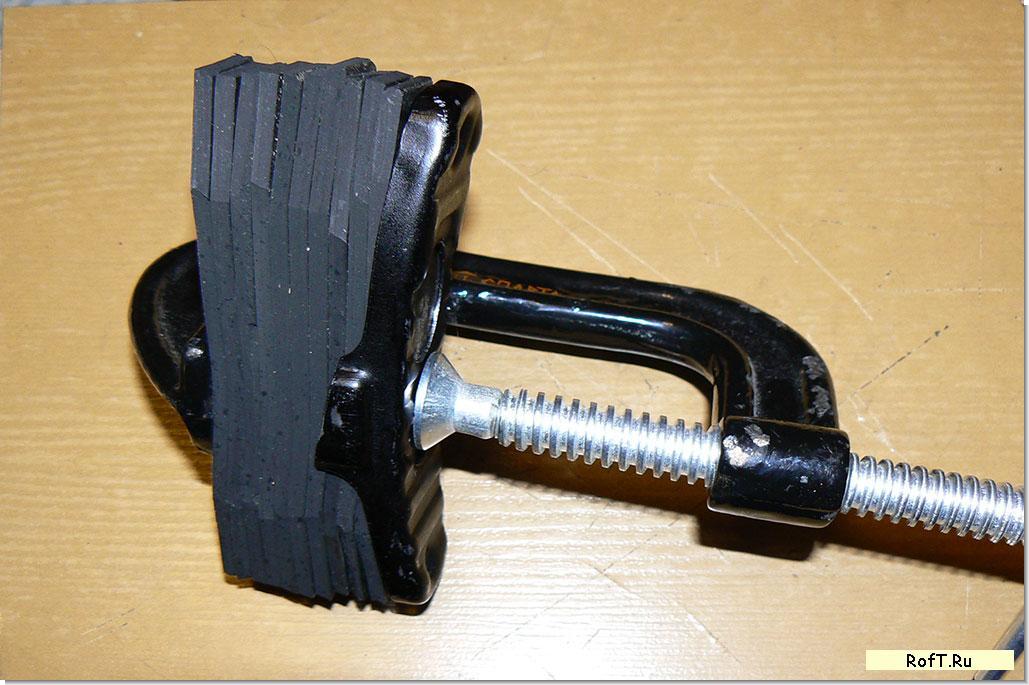 Потом надо нагреть пластик, на который приварена резина и слегка изогнуть. Я пользовался двумя струбцинами, подкладушкой и строительным феном. Кстати, дырки и саморезы подходят родные, не надо ничего лишнего сверлить.