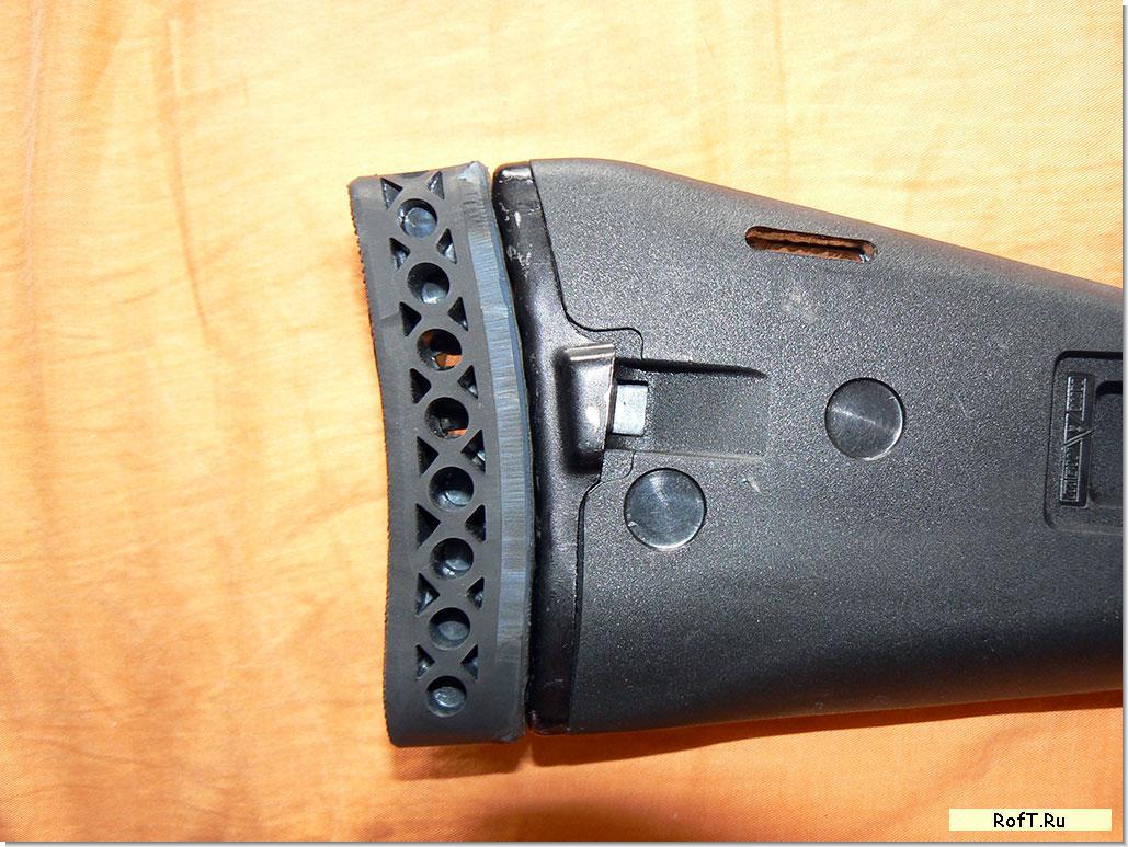 Только я дырку для кнопки не делал. Выбрал под кнопку круглой самодельной коронкой канал в резине почти до самого конца и вставил пластмассовый цилиндрик 1 см длиной в качестве толкателя. Теперь для раскладывания приклада надо слегка нажать в определенном месте затыльника и все. Кто не знает фокуса - приклад не откроет, соответственно стрелять не сможет, т.к. предохранитель заблокирован при сложеном прикладе. Вот результат.