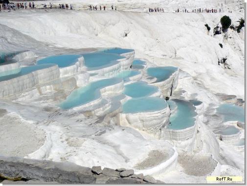Белый, но не белоснежный известняк и голубая вода. Она такая,